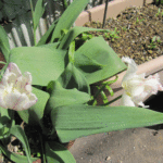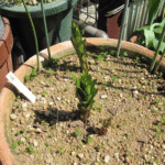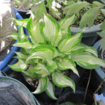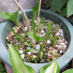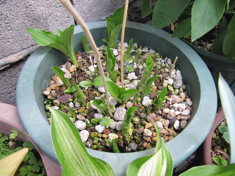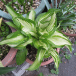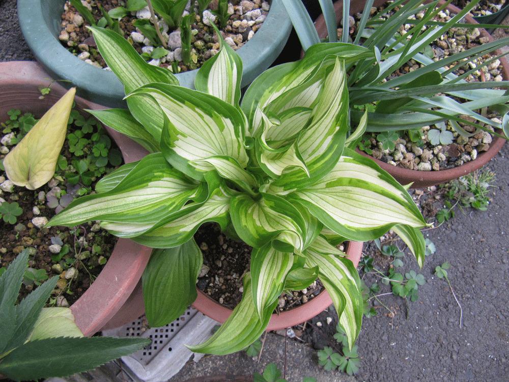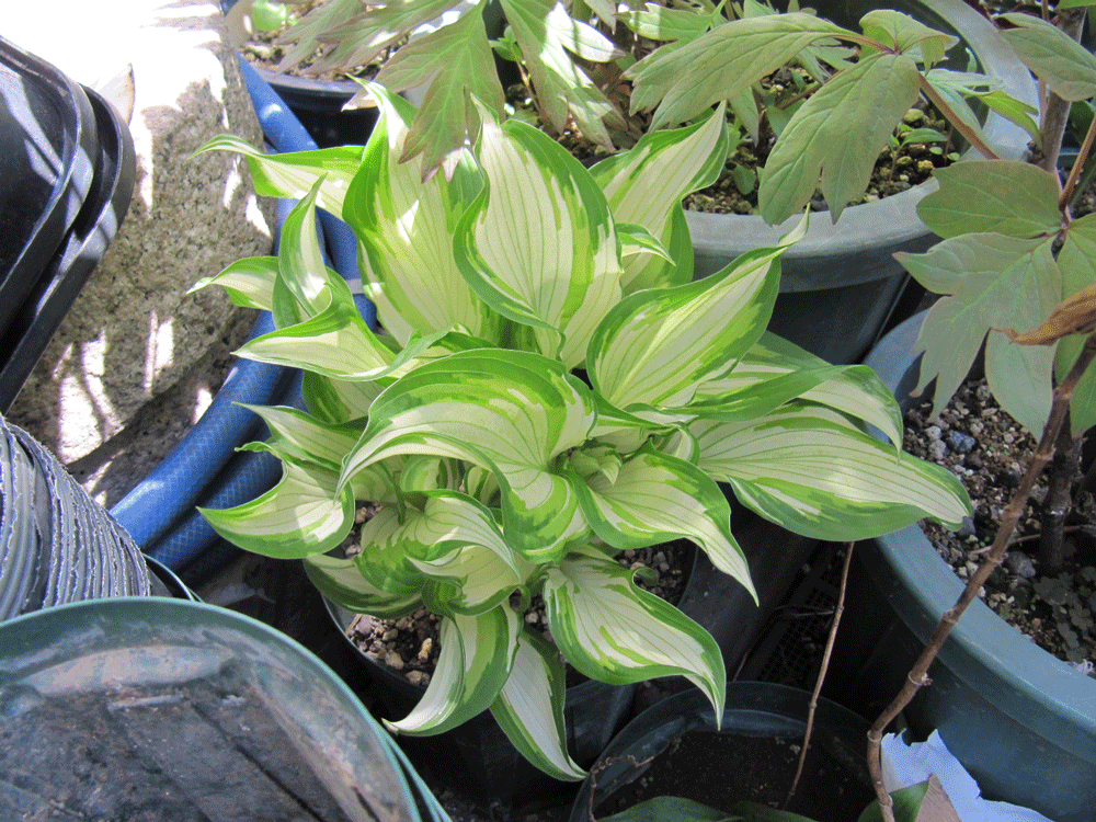 植え替えてそれなりに日が経ったのでギボウシにも動きが(斑入り)。