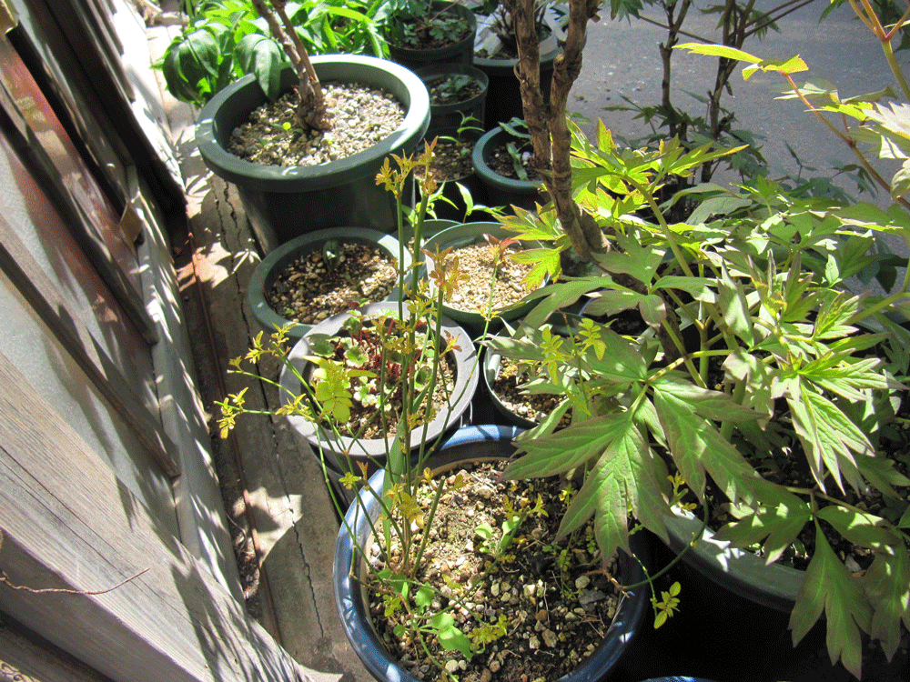 梅雨や夏の日差しが強い時期に牡丹の葉に隠れるように