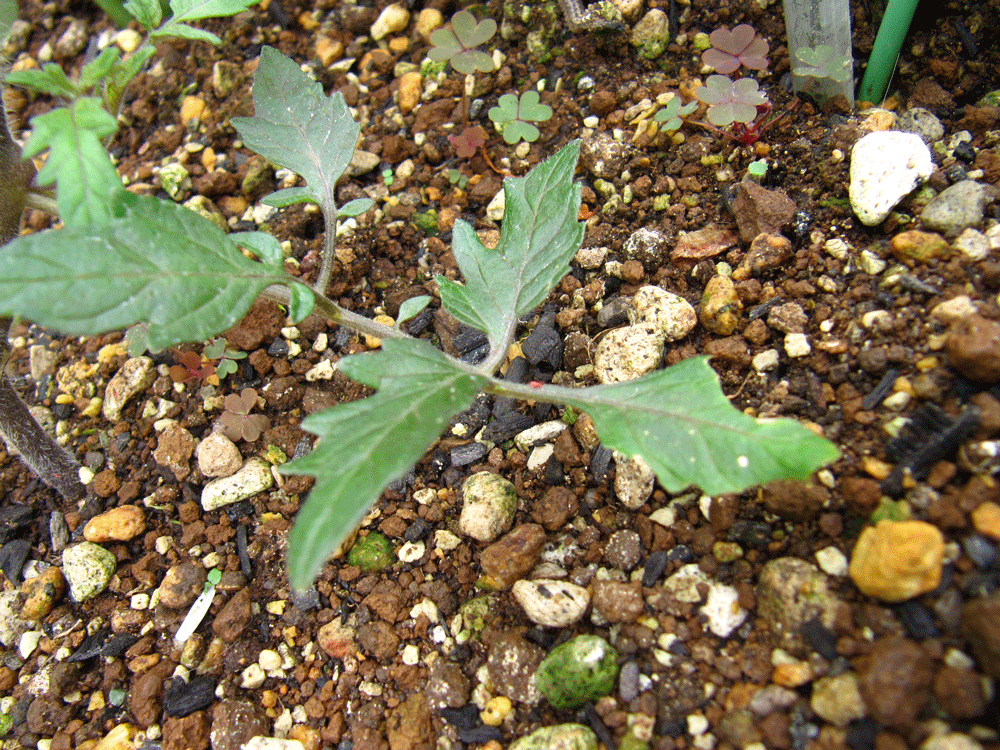 が1株別に植えてあるトマトの苗にアブラムシ発見。