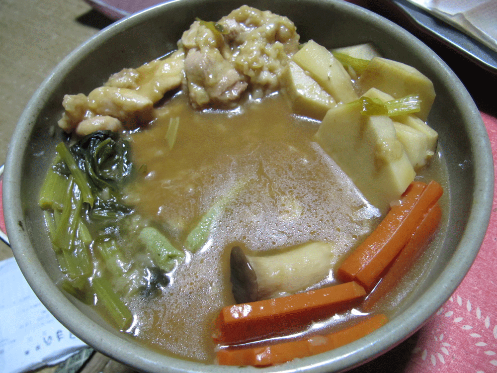 12時方向から時計回りに鶏肉・里芋・人参・エリンギ・小松菜