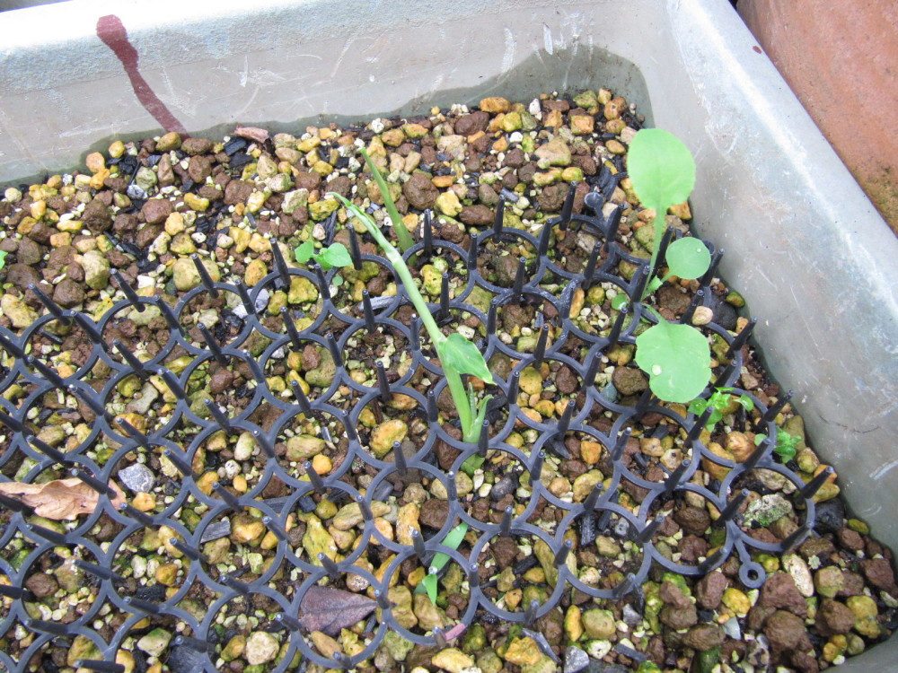 右写真の黒いやつは野良猫が土を掘り糞をするので猫除けです。