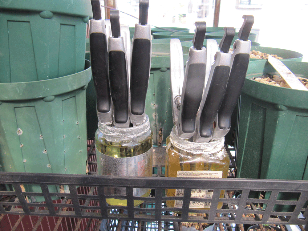 剪定ハサミを浸している様子で黒のクリップ?の向きで