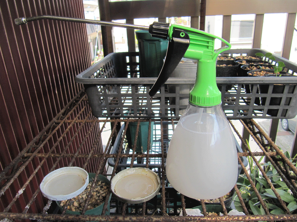 左は希釈した「セイビアーフロアブル」が入っている霧吹き