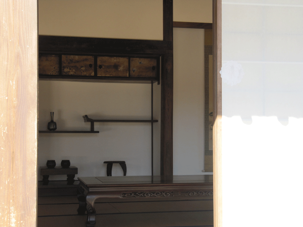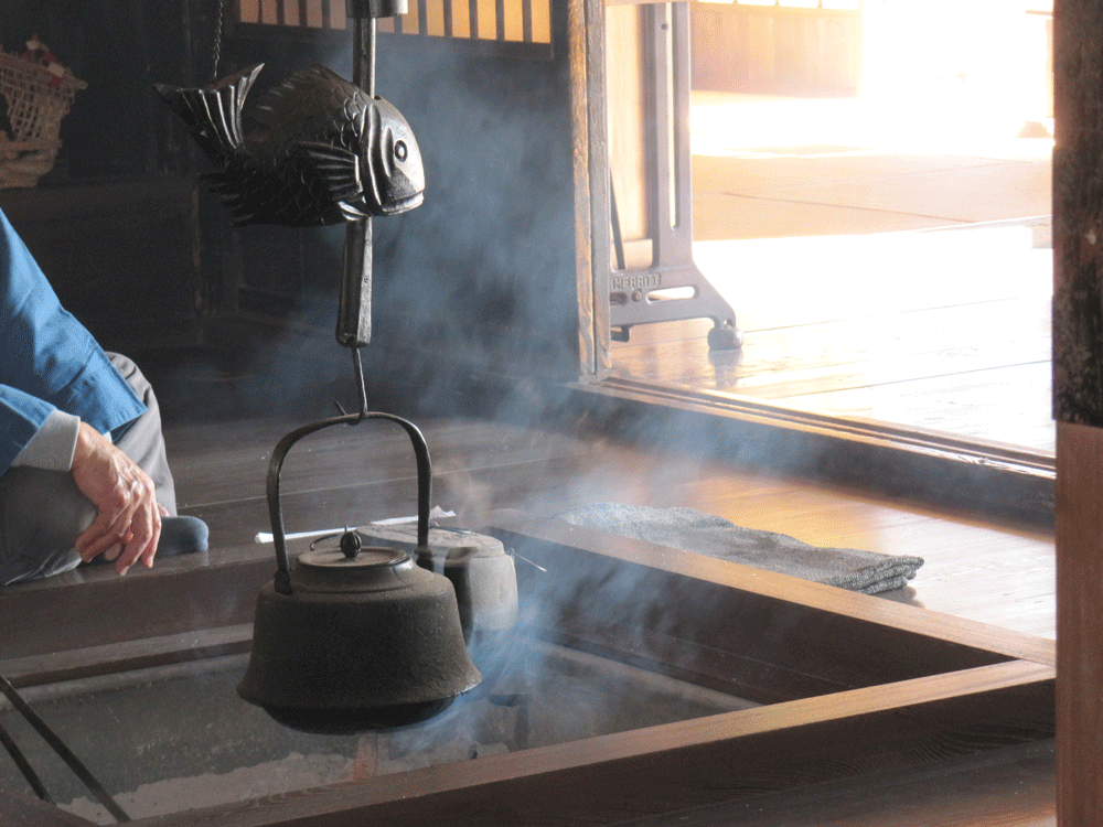 囲炉裏の所に係りの人がいて火を焚いていました。