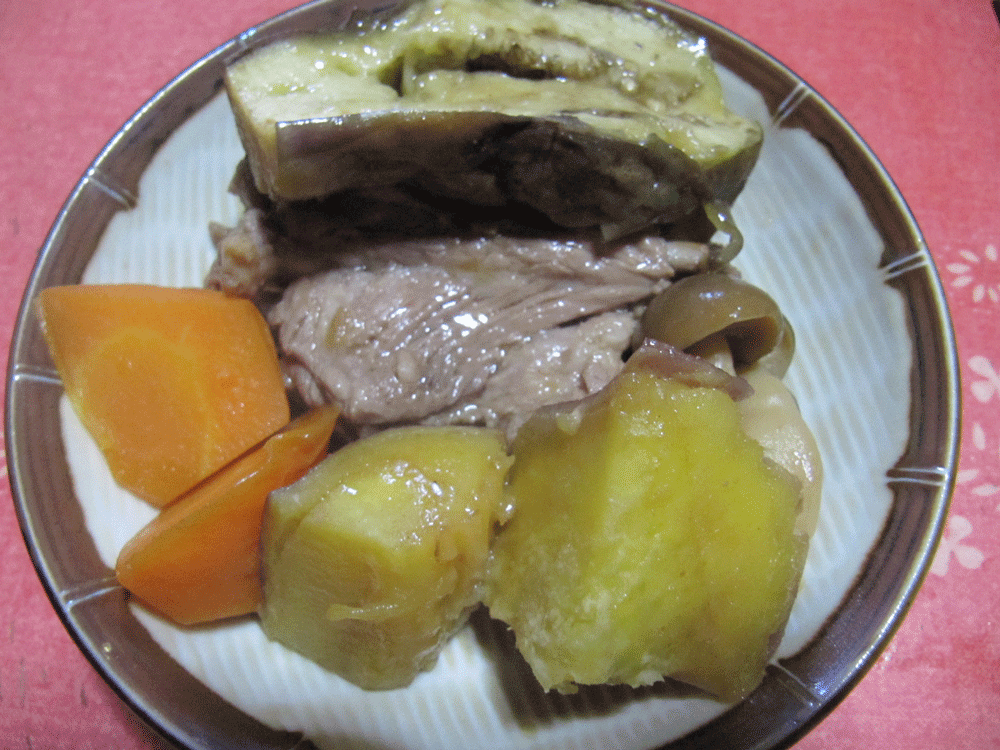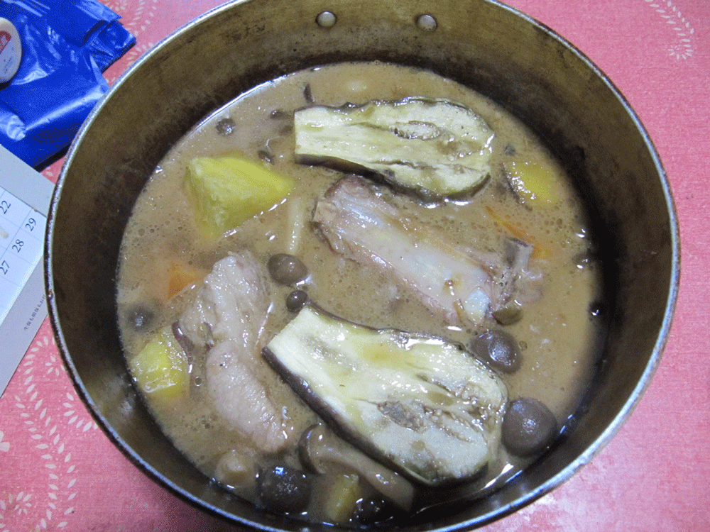 材料はスペアリブ、にんじん、シメジ、さつま芋、茄子といったところだったと。
