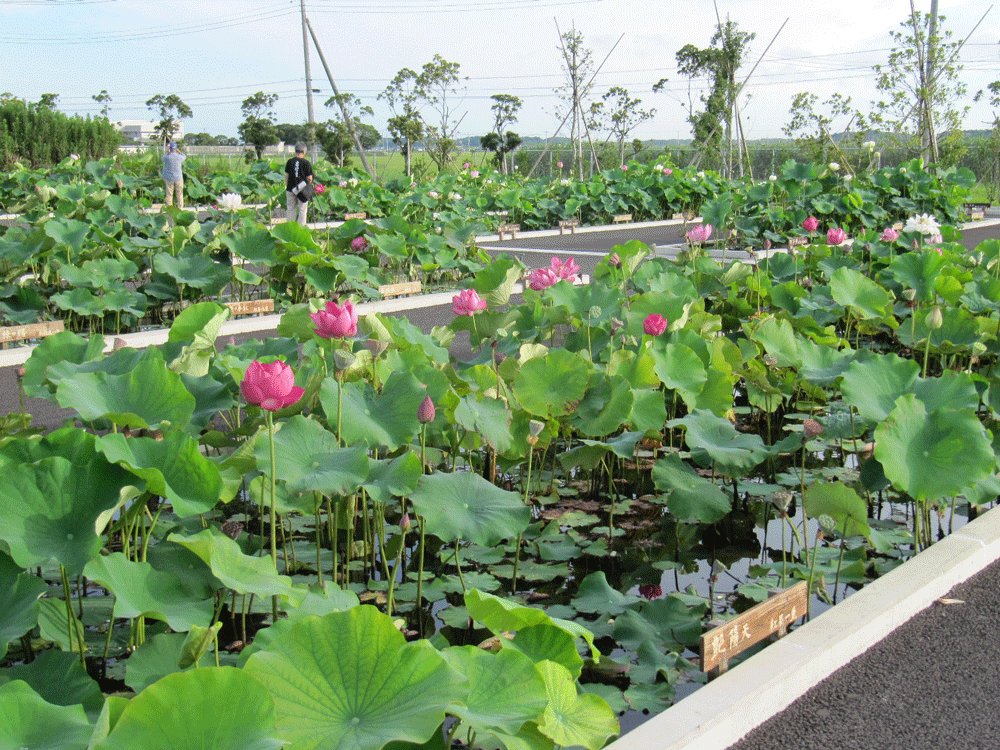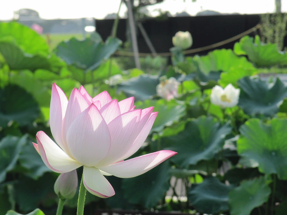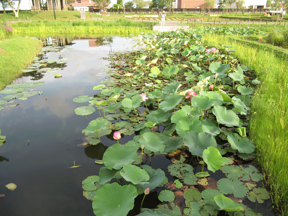 2年前は品種ごとに植わってたエリアでは白い臼型の睡蓮池に